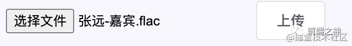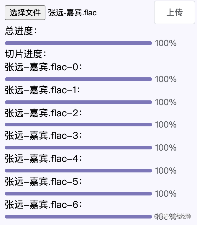 + <div style="width: 300px">+ 总进度:+ <el-progress :percentage="totalPercent"></el-progress>+ 切片进度:+ <div v-for="item in fileObj.chunkList" :key="item">+ <span>{{ item.chunkName }}:</span>+ <el-progress :percentage="item.percent"></el-progress>+ </div>+</div>+ computed: {+ totalPercent() {+ const fileObj = this.fileObj;+ if (fileObj.chunkList.length === 0) return 0;+ const loaded = fileObj.chunkList+ .map(({ size, percent }) => size * percent)+ .reduce((pre, next) => pre + next);+ return parseInt((loaded / fileObj.file.size).toFixed(2));+ },+ },我们再次上传音乐,查看效果: