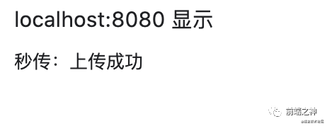 async handleUpload() { const fileObj = this.fileObj; if (!fileObj.file) return;+ const { shouldUpload } = await this.verifyUpload(+ fileObj.file.name,+ );+ if (!shouldUpload) {+ alert("秒传:上传成功");+ return;+ } const chunkList = this.createChunk(fileObj.file); this.fileObj.chunkList = chunkList.map(({ file }, index) => ({ file, size: file.size, percent: 0, chunkName: `${fileObj.file.name}-${index}`, fileName: fileObj.file.name, index, })); this.uploadChunks(); },+ async verifyUpload (fileName) {+ const { data } = await this.axiosRequest({+ url: "http://localhost:3000/verify",+ headers: {+ "content-type": "application/json",+ },+ data: JSON.stringify({+ fileName,+ }),+ });+ return data+ }现在我们重新上传音乐,因为服务器上已经存在了张远-嘉宾这首歌了,所以,直接 alert 出秒传:上传成功