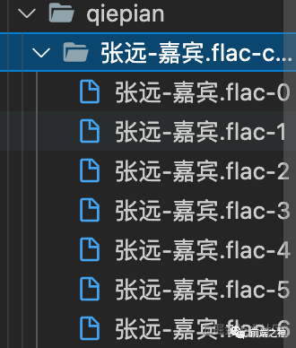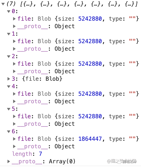 <input type="file" @change="handleFileChange" /><el-button @click="handleUpload"> 上传 </el-button>data() { return { fileObj: { file: null } }; }, methods: { handleFileChange(e) { const [file] = e.target.files if (!file) return this.fileObj.file = file }, handleUpload () { const fileObj = this.fileObj if (!fileObj.file) return const chunkList = this.createChunk(fileObj.file) console.log(chunkList) // 看看chunkList长什么样子 }, createChunk(file, size = 5 * 1024 * 1024) { const chunkList = [] let cur = 0 while(cur < file.size) { // 使用slice方法切片 chunkList.push({ file: file.slice(cur, cur + size) }) cur += size } return chunkList }例子我就用我最近很喜欢听得一首歌