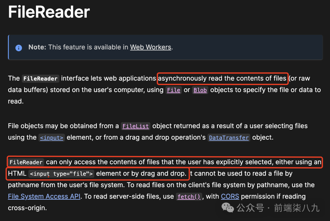 FileReader 是一个前端浏览器 API,允许我们异步读取文件内容并将其转换为可用的数据格式,如文本或二进制数据。