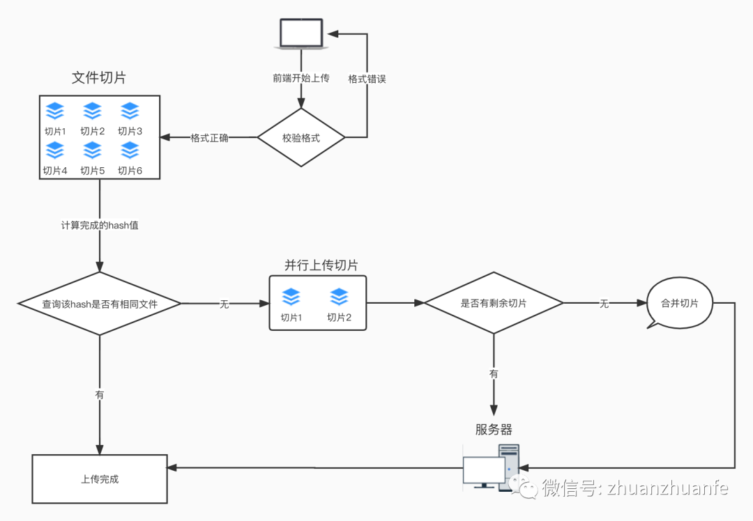 // 检查是否已存在相同文件 async function checkAndUploadChunk(chunkList, fileMd5Value) { const requestList = [] // 如果不存在,则上传 for (let i = 0; i < chunkList; i++) { requestList.push(upload({ chunkList[i], fileMd5Value, i })) } // 并发上传 if (requestList?.length) { await Promise.all(requestList) } } // 上传chunk function upload({ chunkList, chunk, fileMd5Value, i }) { current = 0 let form = new FormData() form.append("data", chunk) //切片流 form.append("total", chunkList.length) //总片数 form.append("index", i) //当前是第几片 form.append("fileMd5Value", fileMd5Value) return axios({ method: 'post', url: BaseUrl + "/upload", data: form }).then(({ data }) => { if (data.stat) { current = current + 1 // 获取到上传的进度 const uploadPercent = Math.ceil((current / chunkList.length) * 100) } }) }在以上代码中,我们在上传切片的同时,也会告诉后端当前上传切片的 index,后端接收后,记录该 index 以便在合并时知道切片的顺序。