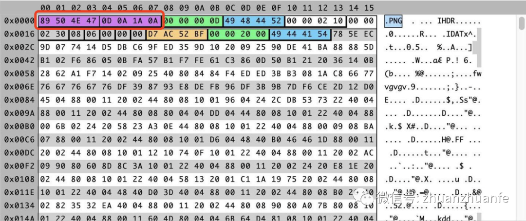 那就是通过查看文件的二进制数据来识别其真实的文件类型,因为计算机识别文件类型时,并不是真的通过文件的后缀名来识别的,而是通过 “魔数”(Magic Number)来区分,对于某一些类型的文件,起始的几个字节内容都是固定的,根据这几个字节的内容就可以判断文件的类型。借助十六进制编辑器,可以查看一下图片的二进制数据,我们还是以test.png为例: