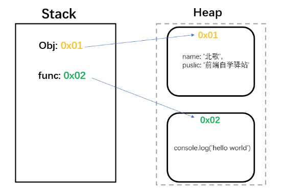 let obj = { name: '北歌', puslic: '前端自学驿站'}let func = () => { console.log('hello world')}栈