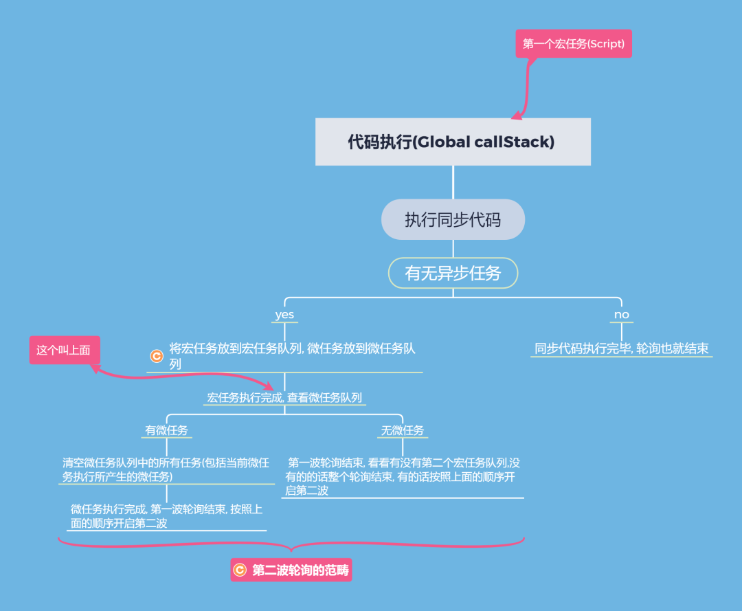 其实相对难以理解的也就是微任务,对于微任务也就是上面说的只有一个队列会在此次轮询中一次清空 (包括此次执行过程中所产生的微任务)。