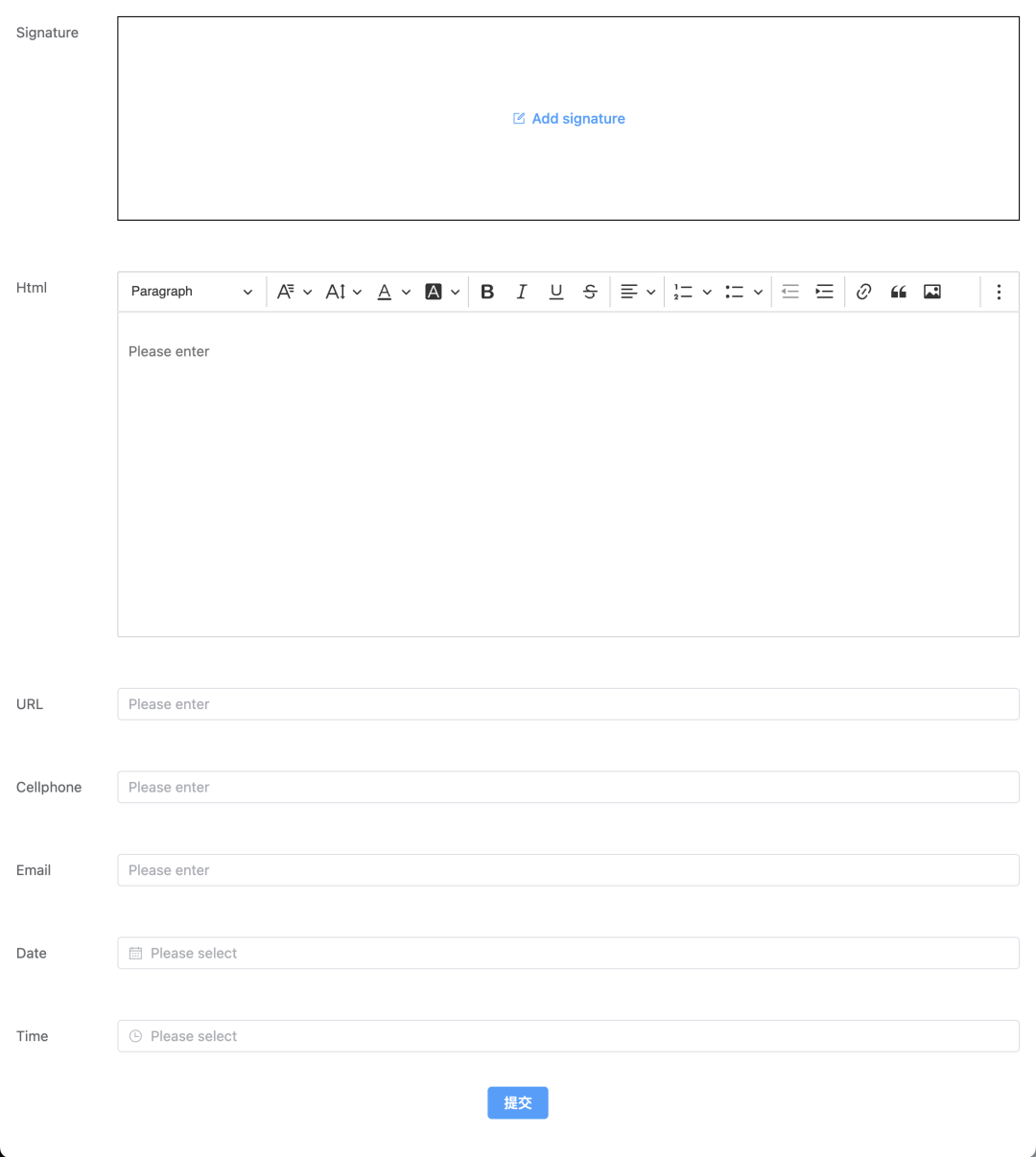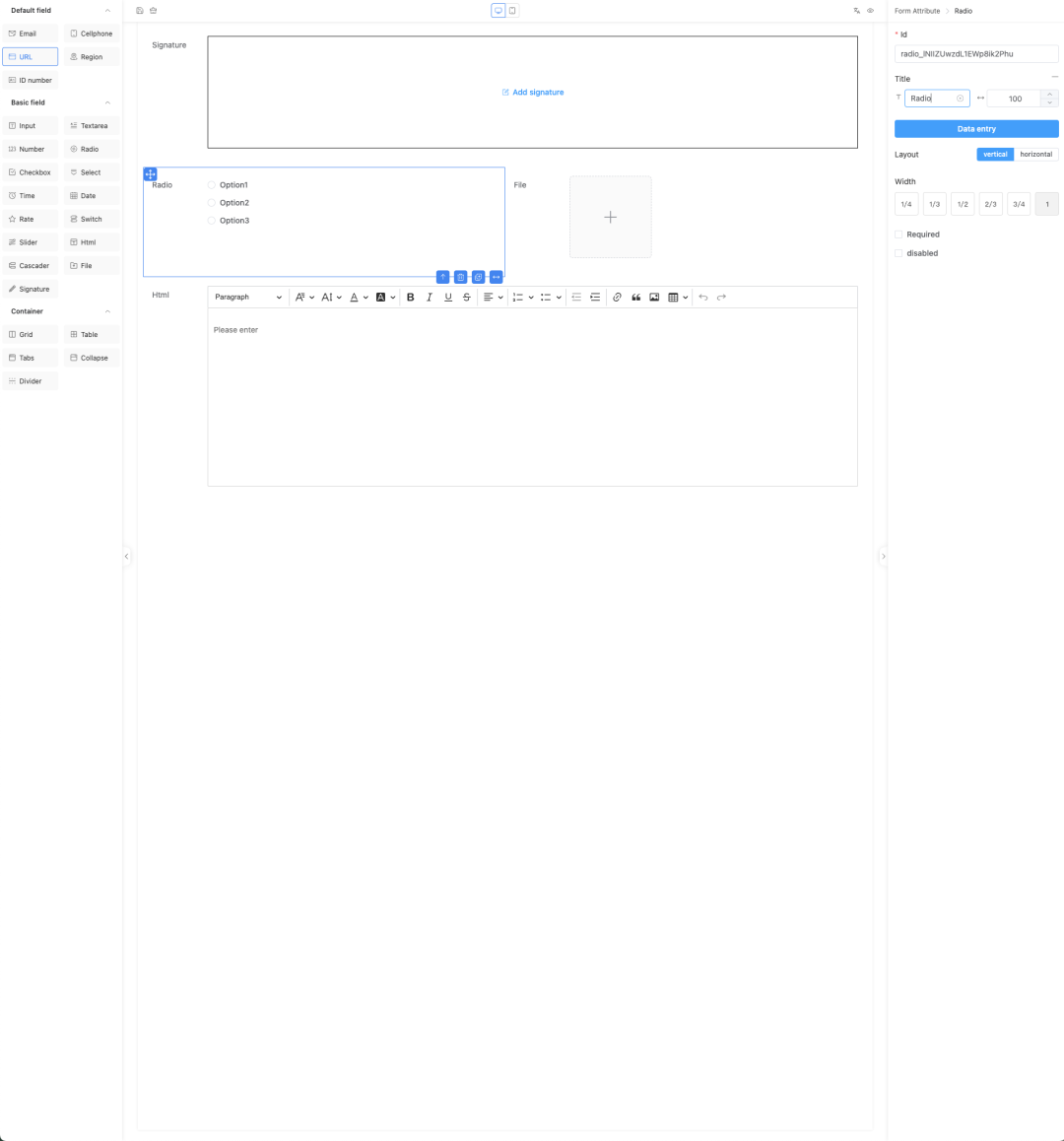 提供多种字段 (单行文本、邮箱、身份证号、手机号、网址、多行文本、数字、单选框、多选框、时间、日期、评分、开关、滑块、Html 编辑器、级联、上传文件、签名、省市区)