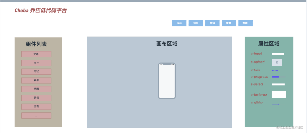 不难看出和市面上大部分低代码平台一样,由三部分组成:左侧组件列表、中间画布区域、右侧属性区域。