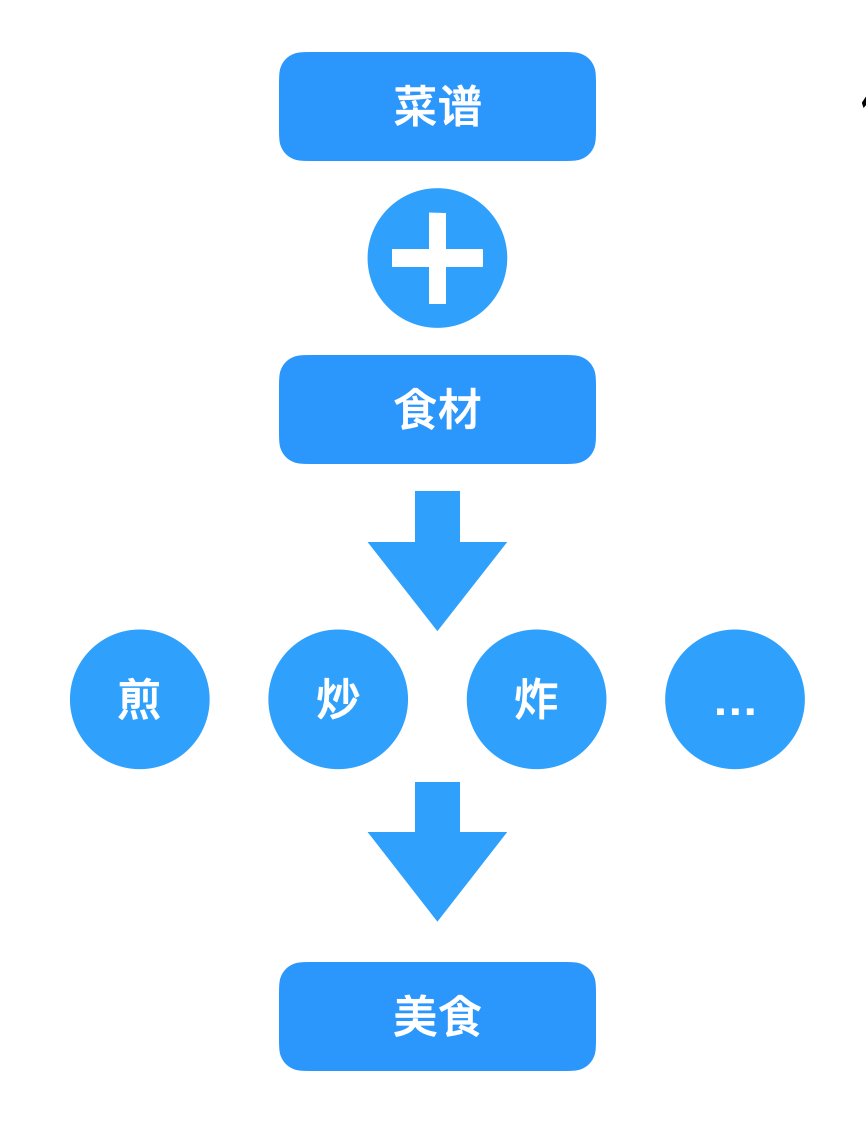 正如烹饪一样,为了做成功一份美食,我们需要菜谱和食材,然后通过不同的处理方式,比如煎、炒、炸等烹饪方式做出来一道菜。