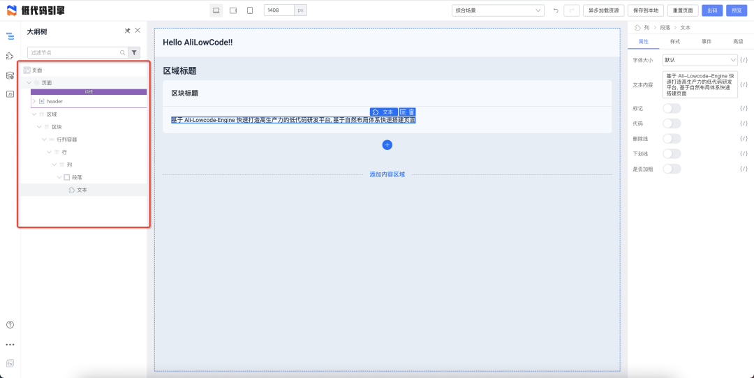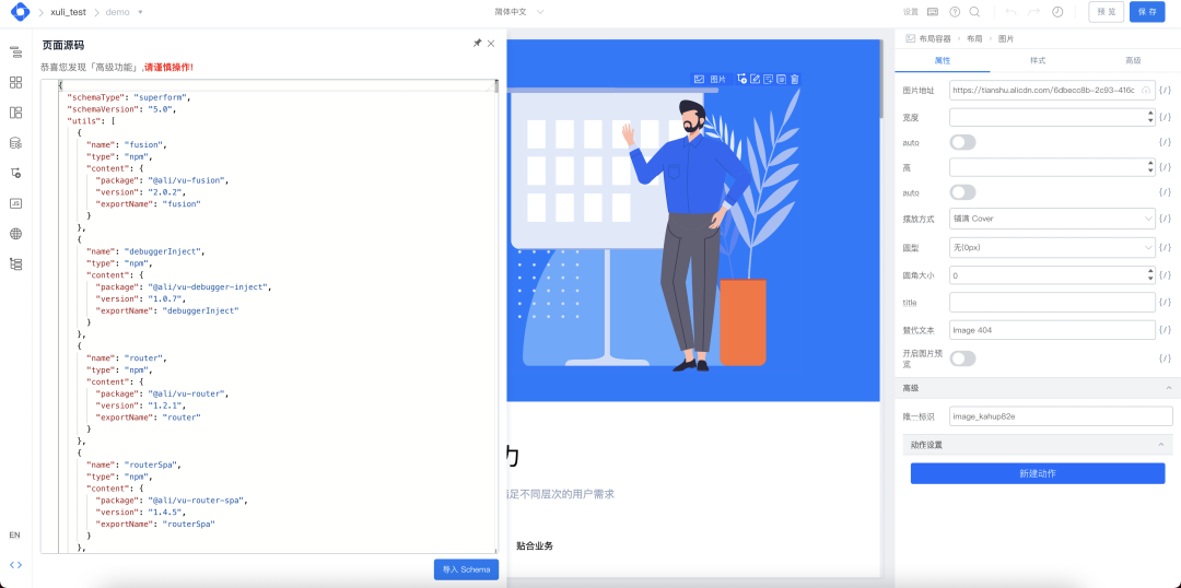 比如下图阿里内部的某低代码平台,阿里对外的低代码产品有宜搭。他们都是通过可视化,即拖拽、配置,再加上很少的代码来设计出页面。