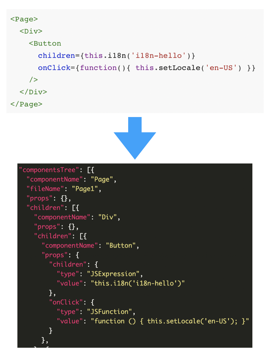 协议也可以理解为是 React/Vue 等 ProCode 代码和低代码 json 源码如何互相解析的说明
