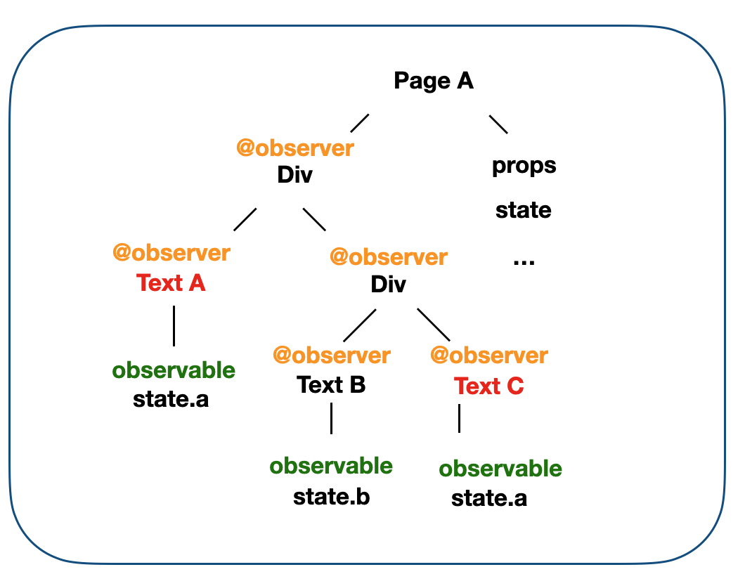 我们实现的方式就是利用了 mobx,如下图所示我们将 state 和 props 进行 observable。并对每一个组件都进行 observer 观测,当组件用到的 state 或者 props 产生变化的时候,mobx 会控制其进行更新。