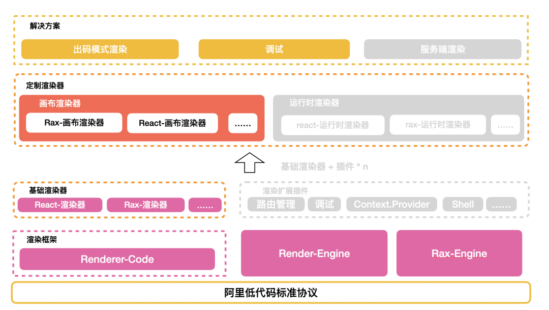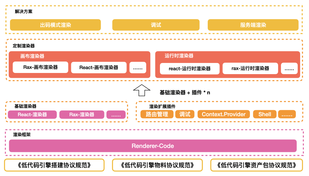 在低代码引擎标准协议的基础上,将运行时的通用逻辑进行下沉到 Renderer-Core 中,并基于它实现 React 渲染器和 Rax 渲染器。其他差异性的运行时渲染能力比如画布渲染、应用渲染等通过扩展插件来实现。
