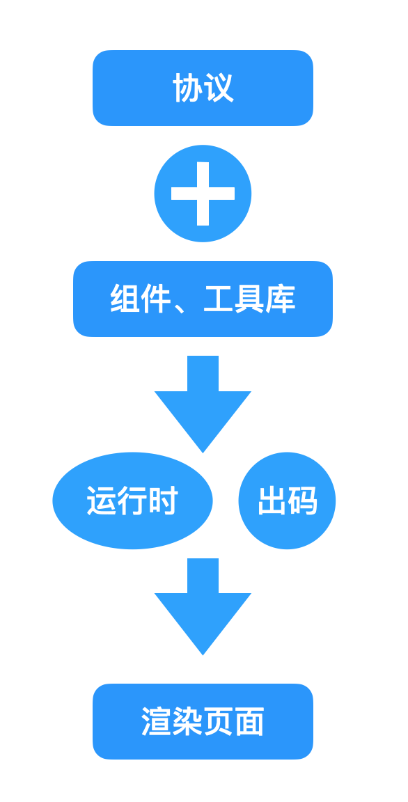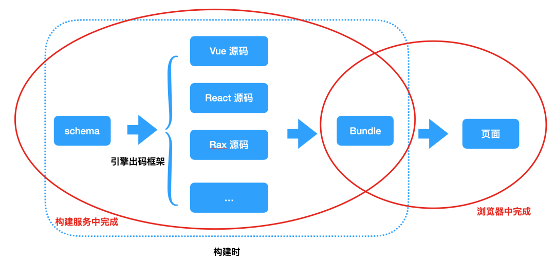以上的过程大多数都是在构建服务中进行的,而 Bundle 渲染为页面是在浏览器中完成的,这一部分本身都是依赖市面上成熟的前端框架,比如 React、Vue 等,所以这时候在浏览器的运行时已经不存在低代码渲染了。