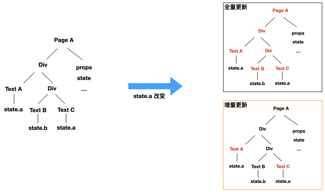 全量更新就是只要数据源发生变化,我们就从页面的顶层节点,也就是 Page 开始从头开始再次进行计算、递归子元素并对 props 进行计算。也就是每一个节点都会重新计算和渲染。