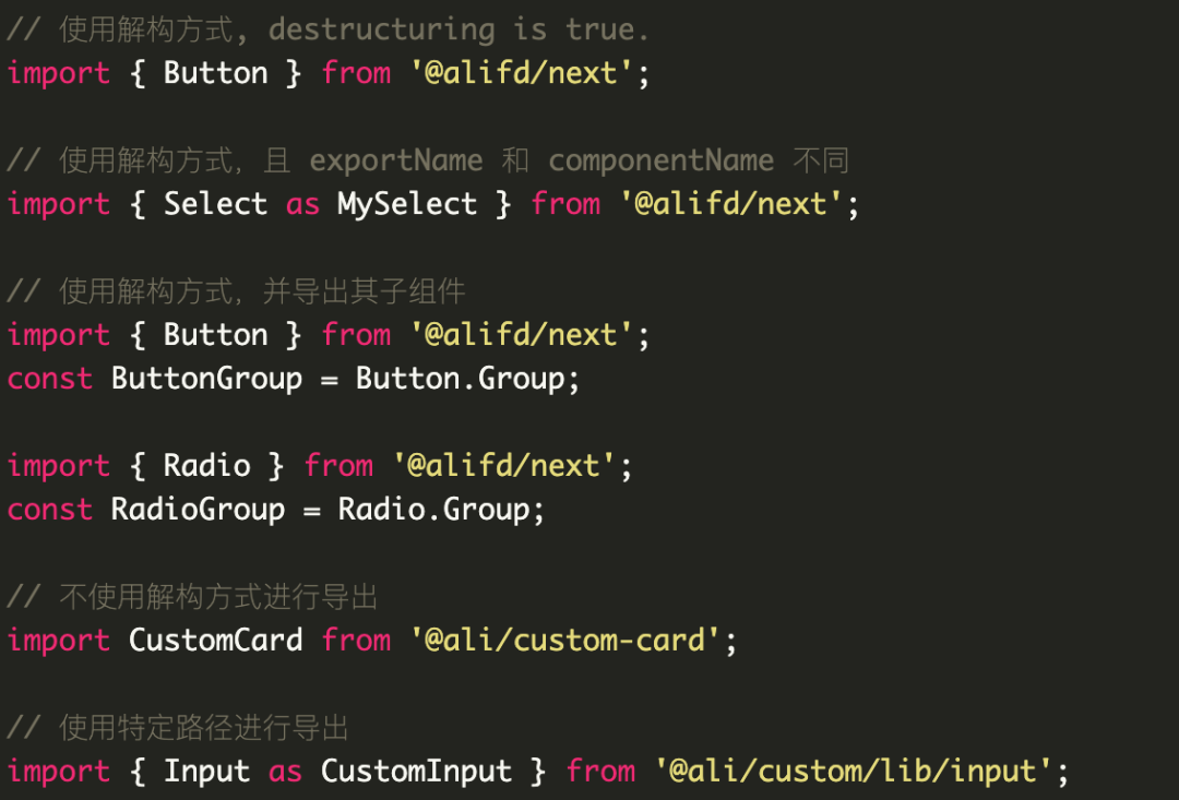 destructuring 为 true 表示我们用解构的方式来获取组件。当然我们还有其他的描述字段来保证能支持各种组件的导出方式。