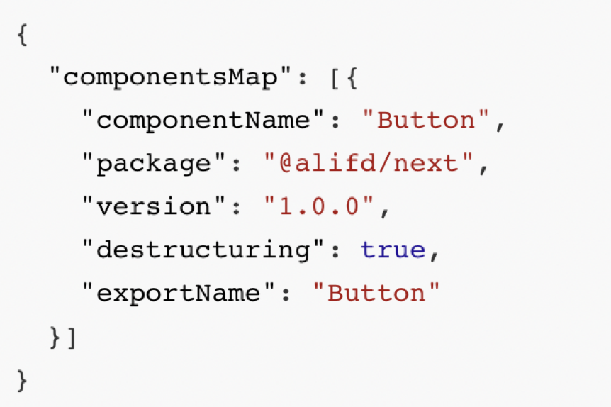 我们通过搭建协议中 componentsMap 的描述信息,可以知道 Button 组件是在 @alifd/next 中。