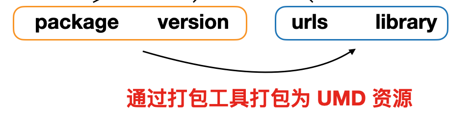 当我们点击打包构建时,我们会通过 package、version 等信息,将其打包成 UMD 资源,作为资产包中的 urls。
