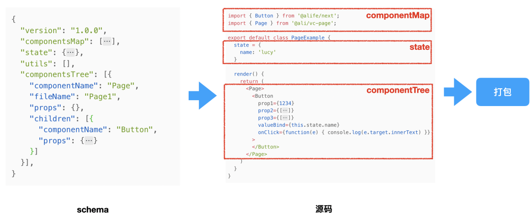 出码渲染是将 schema 转化为 Vue 源码、React 源码或者其他语言的源码。当然就像 React 工程需要进行打包构建才能在浏览器中渲染一样,我们会将 React / 其他源码进行打包,打包成一份 Bundle 文件,之后就可以在浏览器中进行消费,渲染出页面了。