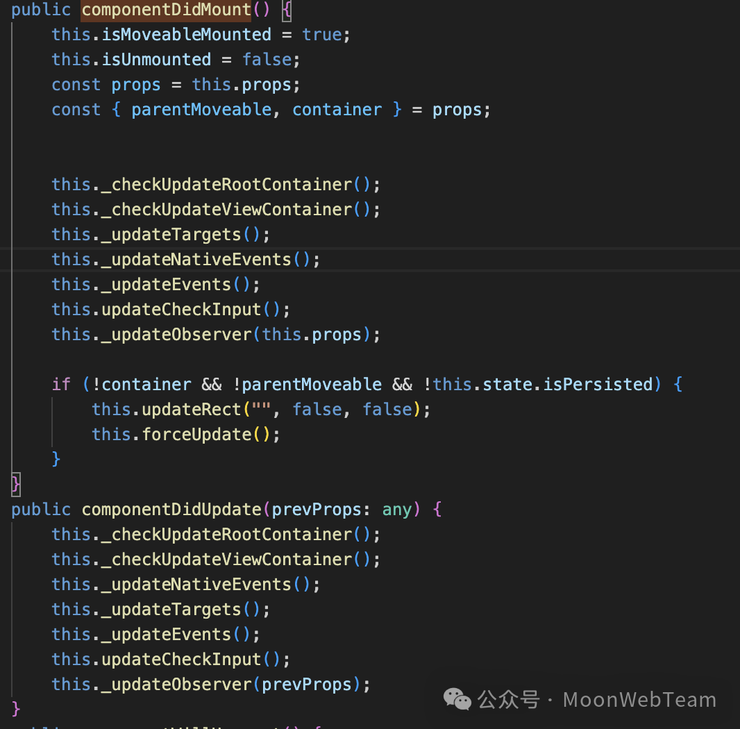 containerProvider = renderSelf( <InnerMoveable ref={ref(this, "innerMoveable")} {...nextOptions} {...events} /> as any, selfElement,);export function ref(target: any, name: string) { return (e: any) => { e && (target[name] = e); };}moveable 的核心都在 《MoveableManager》(https://github.com/daybrush/moveable/blob/master/packages/react-moveable/src/MoveableManager.tsx) 这个类上,它本身是一个 react 的组件,利用 react 的生命周期方法来管理自身的状态。