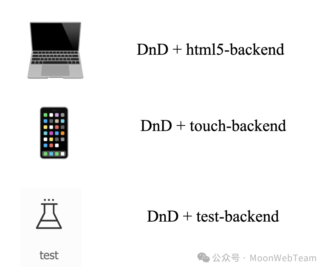 所以 React DnD 并不能单独使用,需要额外的后端模块使用 react-dnd-html5-backend,这个后端模块则是利用浏览器的 drag 和 drop 接口具体实现拖拽的交互。其他的后端模块还有 react-dnd-touch-backend,这可以允许在移动端实现拖拽交互。以及 react-dnd-test-backend 对测试的支持。