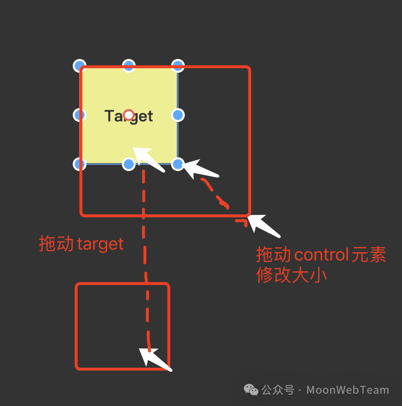 例如:监听目标元素的 drag 事件,修改元素的位置,可以实现 draggable 的能力。监听 control 元素的 drag 事件,更新 control 的位置和修改目标元素的大小,可以实现 scalable 和 resiable 的能力。