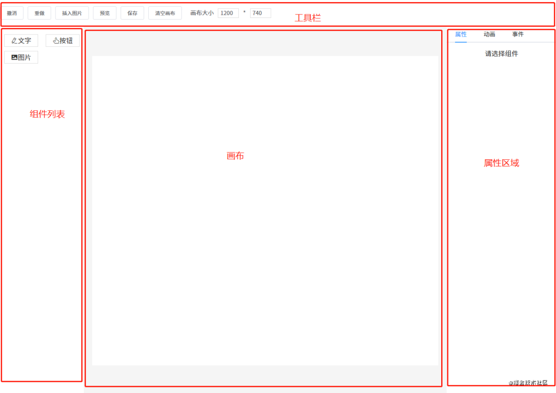 这一节要讲的编辑器其实就是中间的画布。它的作用是:当从左边组件列表拖拽出一个组件放到画布中时,画布要把这个组件渲染出来。