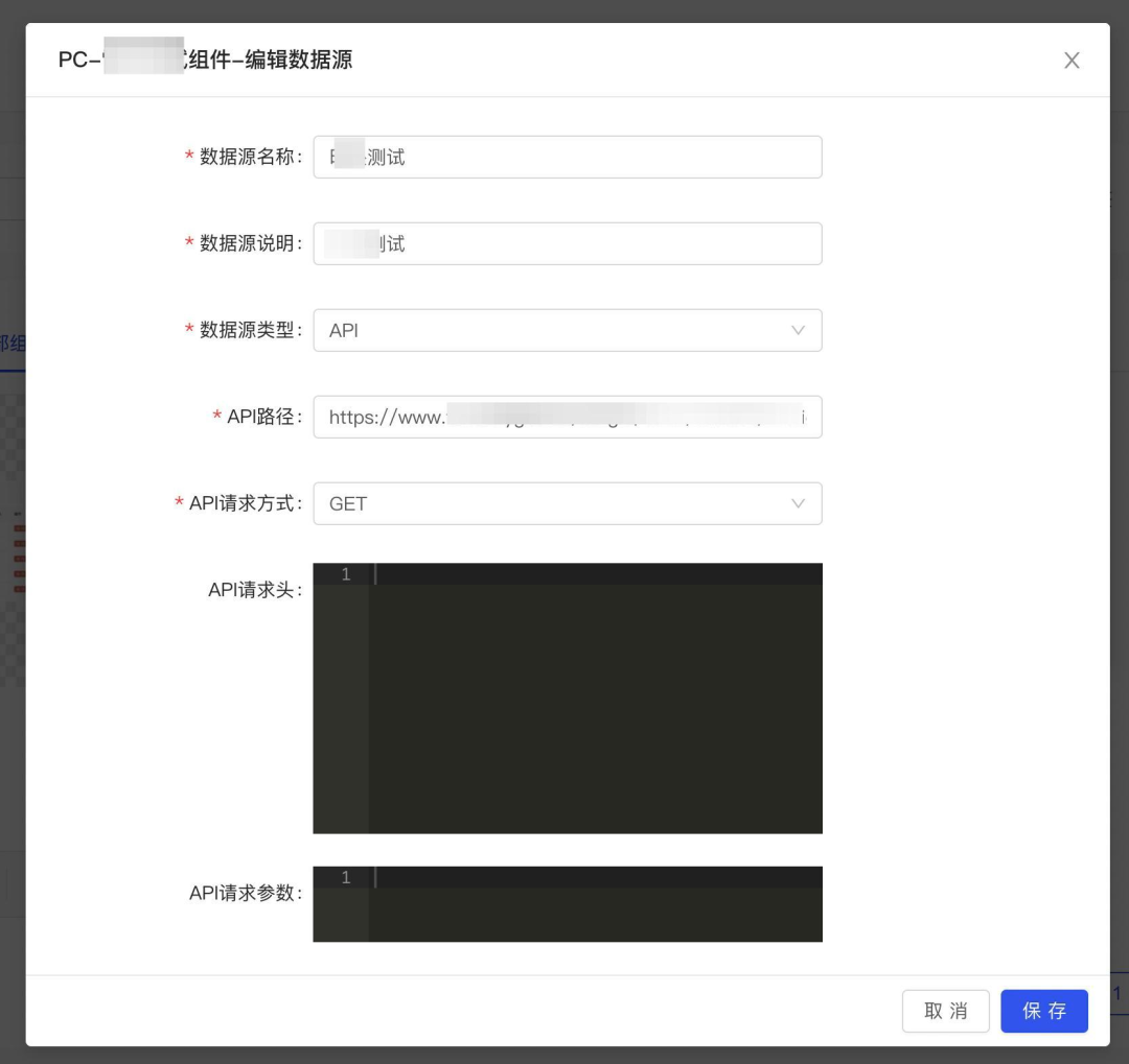 新增数据源,目前我们使用最多的数据源多为 API 类型,也就是我们每天都在浏览器里看到的接口,在新增弹窗内输入我们已有的接口或者神笔注册的接口信息,配置好接口地址,请求方式,请求头,请求参数,以及最重要的接口出参字段与组件数据字段之前的映射关系,输入完成后就完成了数据源与组件的关联。