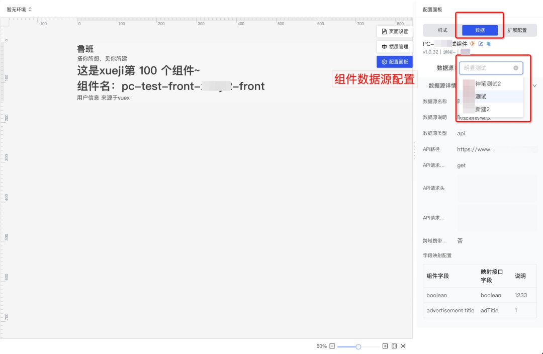 进入我们需要搭建的页面,选择我们已绑定数据源的组件,右侧配置面板选择我们绑定的数据源,保存页面配置,即可完成在页面组件中使用数据源。