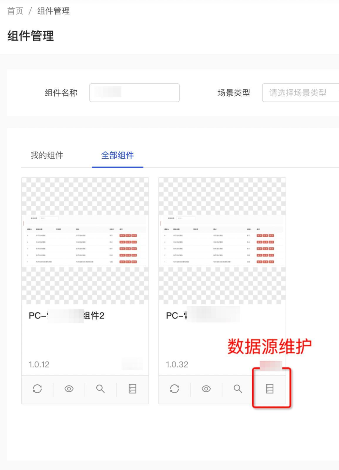 进入组件管理,选择需要关联的组件,点击数据源维护。由于组件业务属性不同,对应的数据源也会存在差异性,为了避免运营同学配置数据源时,出现选择困难症,我们以组件维度关联数据源,一个组件可以关联多个数据源,搭配数据源描述,让运营同学可以最快选到需要的数据源。