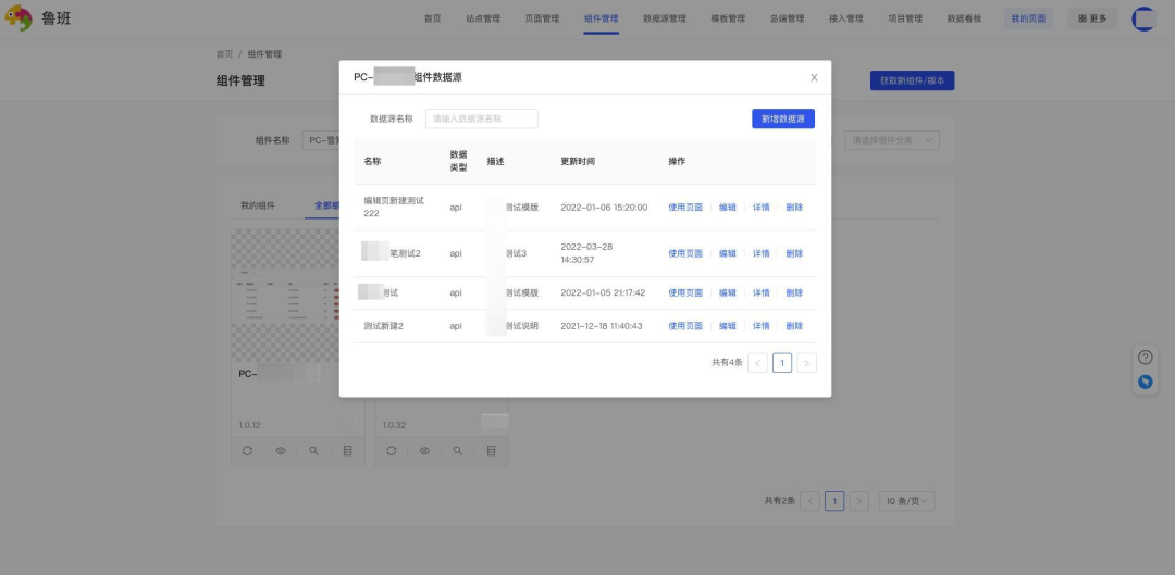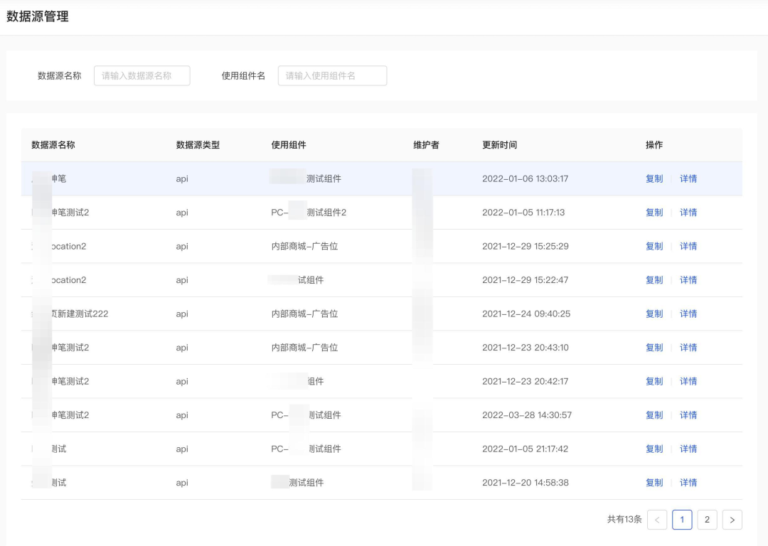 为了提高数据源的复用性,我们提供了数据源管理中心,这里可以看到整个系统所有维护的数据源,方便跨组件跨业务团队数据源复制复用。