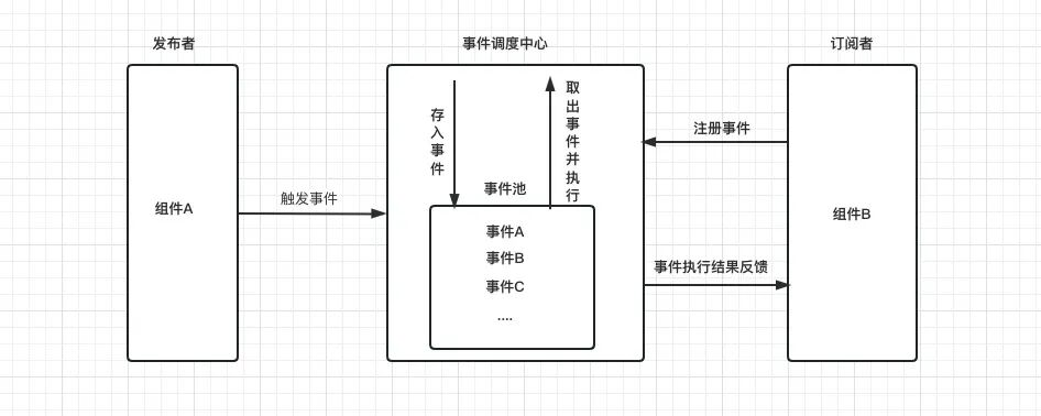 我们设计一个事件调度中心,可以处理所有的事件注册与事件响应。订阅者发布对应的事件,事件调度中心负责将事件放入事件池中。发布者负责在对应的时机触发对应事件,上面例子中,组件 A 就是发布者,当组件 A 被点击的时候,就是触发事件的对应时机。事件在调度中心出发后,再将结果反馈给订阅者。订阅者拿到反馈结果做出行为。
