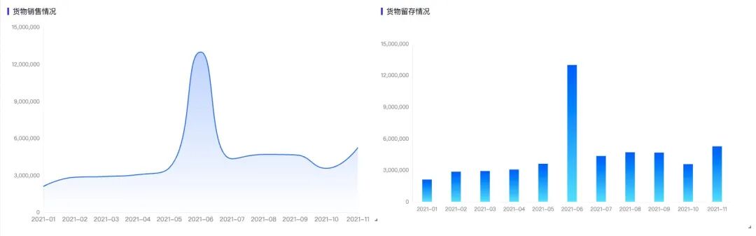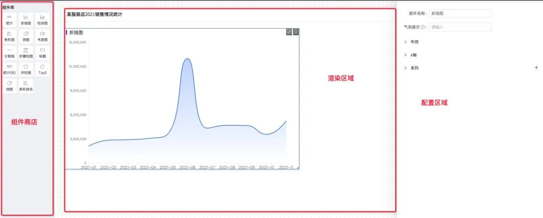 [ { "type": 'line', // 类型 "id": 1, // 唯一标识 "data": [], // 数据存放 "title": "货物销售情况", // 组件标题 "layout": { x: 0, y: 0, w: 3, h: 2 }, // 页面布局信息(坐标、宽高) }, { "type": 'bar', "id": 2, "data": [], "title": "货物留存情况", "layout": { i: 'c', x: 3, y: 0, w: 3, h: 2 }, }]有了这样一份数据结构之后,接下来,我们接下来就要开发组件,比如{type:line}的配置项就去用 line 组件渲染,并且我们需要把数据还有一些其他配置项传给组件。关于每个组件的开发,这里就不深入探讨了,需要考虑的就是你的内部组件要具有接受数据并处理配置的能力。