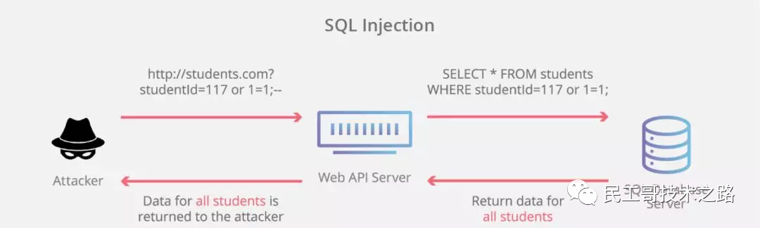 GET xx/userinfo?id=1%20or%201=1其中请求参数 id 转义后就是 1 or 1=1,如果后端不做安全过滤直接提交数据库查询,SQL 语句就变成了: