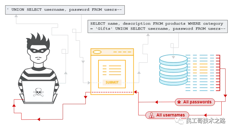 而如何让 Web 服务器执行攻击者的 SQL 语句呢?SQL 注入的常规套路在于将 SQL 语句放置于 Form 表单或请求参数之中提交到后端服务器,后端服务器如果未做输入安全校验,直接将变量取出进行数据库查询,则极易中招。