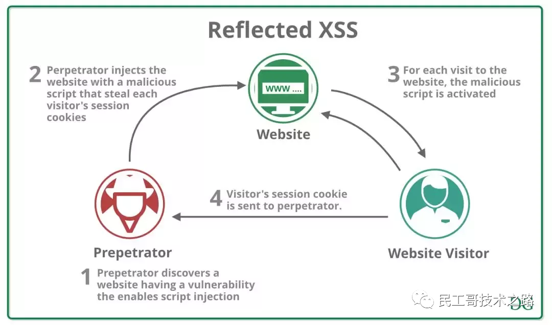 - 1、攻击者将 JS 代码作为请求参数放置 URL 中,诱导用户点击