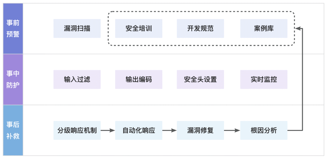 上述文章介绍了前端安全的重要性以及常见的攻击手段,在实际的项目工程中,建议大家分阶段建立防御体系。除了事中防护之外,也要做好事前预警和时候补救的工作,及时总结分析,将问题原因总结至案例库和开发规范,定期开展安全培训。