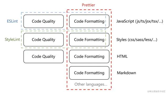 Prettier 也是一个代码样式检查优化的工具,但其可配置的规则很少,除了少部分可配置的规则外,其他都不可更改以此来达到强制性统一代码风格的目的。Prettier 与 ESlint 不同,如下图所示,它不止适用于 JS 代码,还适用于其他前端常用语言,不过它的规则只针对代码样式 (Formatting) 而不针对于代码质量 (Code-quality) 。Prettier 可以单独在项目中使用,也可以与 ESlint 一起搭配使用。