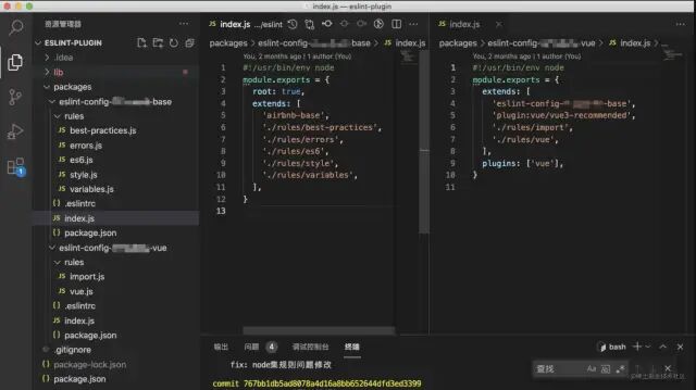 由于 eslint 对于 config 配置包没有提供对应的模版,所以在参照了 airbnb 目录结构之后开始手动新建不同分类的文件,将一些内置规则按照 eslint 中 rules 模块介绍中不同功能块进行划分,然后在 .eslintrc.js 文件中通过 extends 相对路径引入。但是由于 airbnb 他们项目本身使用的技术栈比较简单所以按照这样发布两个包也没什么问题,如果多项目多技术栈按照这样去发包的话则需要管理发布多个包。