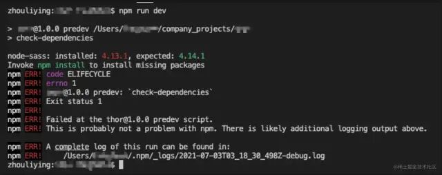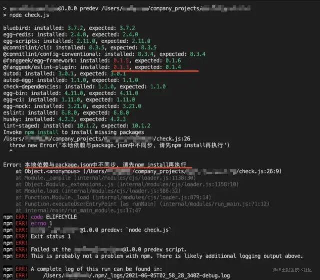 // package.json 文件"scripts": { "predev": "node check.js"}复制代码const output = require('check-dependencies') .sync({ verbose: true, })if (output.status === 1) { throw new Error('本地依赖与package.json中不同步,请先npm install再执行')}复制代码image.png