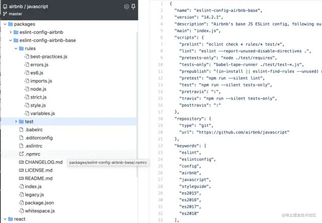 最开始看的是目前前端社区中使用最火的 airbnb,airbnb 主要是在 package 文件中分别建了两份配置,eslint-config-airbnb 中主要是 react 的一些规则配置,eslint-config-airbnb-base 主要是基本规则配置分类。