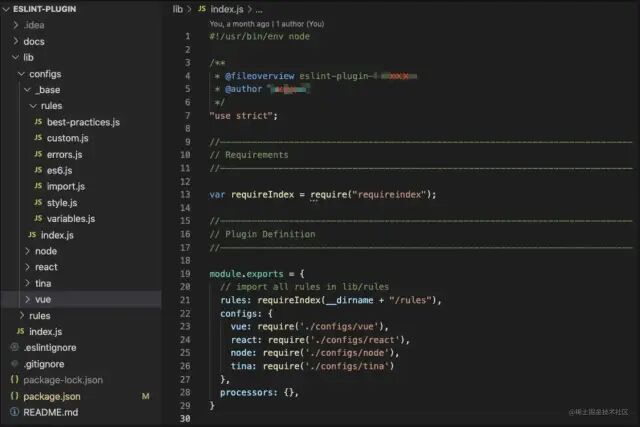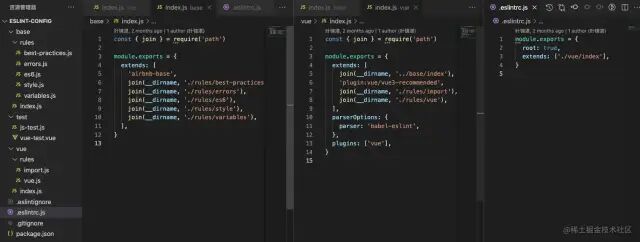 - 'best-practices.js'- 'custom.js'- 'errors.js'- 'es6.js'- 'import.js'- 'tyle.js'- 'variables.js'复制代码最后在 _base 文件下面 index.js 将上述文件与 airbnb-base 包一起作为 extends 引入: