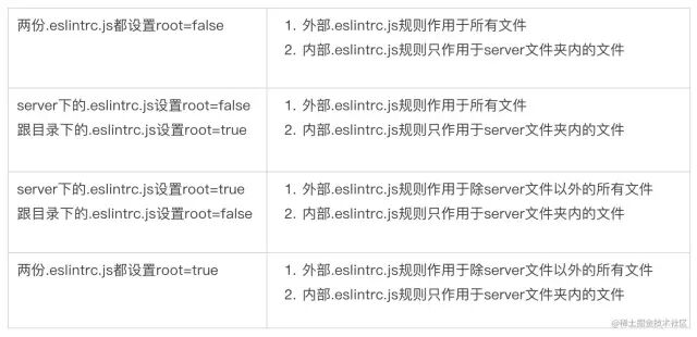 前面介绍 root 参数的时候,有对着官方文档及网上看相关的翻译,总觉得好像不同的翻译都不一样,而且我自己单独对这个概念也模棱两可的,所以就做了一个 root 的一个测试实验。主要是项目 eslint-root-test 根目录下新建一个. eslintrc.js 文件、在根目录的 server 文件夹下也新建一个. eslintrc.js 文件,针对两个. eslintrc.js 中 root 配置不通过的情况进行测试,测试结果如下: