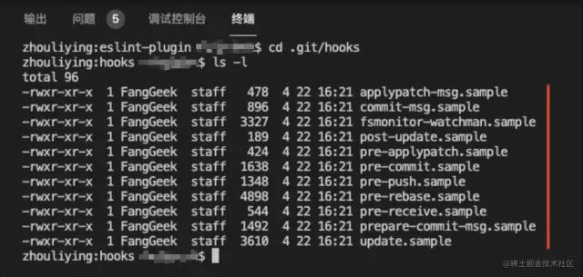 下图中就是各个钩子的案例脚本,可以把 sample 去掉,直接编写 shell 脚本执行: