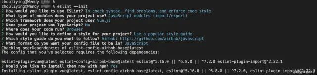执行 npm install eslint \--D 全局安装 ESlint 之后,使用命令 eslint \--init 初始化 eslint 配置文件,执行过程中会询问一些配置化的问题,可以根据自己的需求去进行选择: