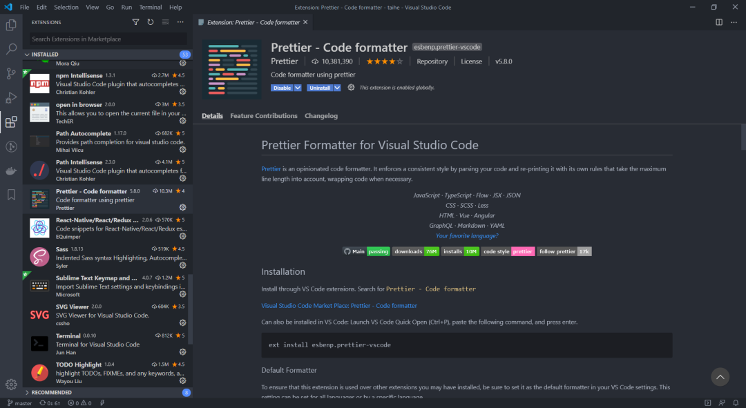 下面是 Prettier 的扩展,我以下安装好了,大家在扩展中自行搜索安装就好了。