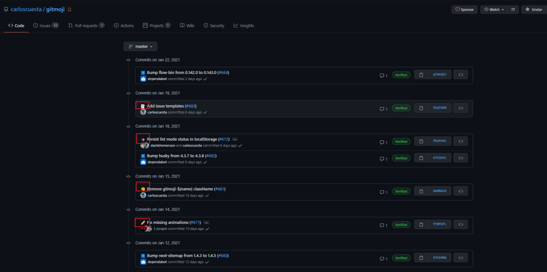 使用:你可以在这个 gitmoji 网站找到更多的表情来丰富你的提交记录,只需要在提交记录中加上类型 :bug: 的代码就可以显示表情了。