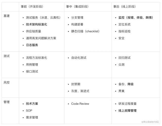 质量保障是一个系统化工程,从开发周期上,可划分为事前、事中、事后三个阶段,事前重【预防】,事中重【检测】,事后重【监控】;从保障手段上,可划分为四个方面:基建、测试、风控和管理。接下来本文将分阶段讲述其中的几个重点事项。