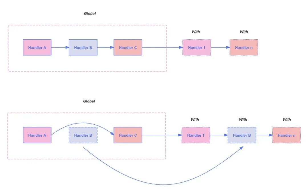 它既可以为已经注册过的全局中间件装配 Payload,也可以携带临时中间件一同挂载 Payload;除了增,也能减;我们也提供了禁用功能,可以禁用那些已经全局注册的中间件;