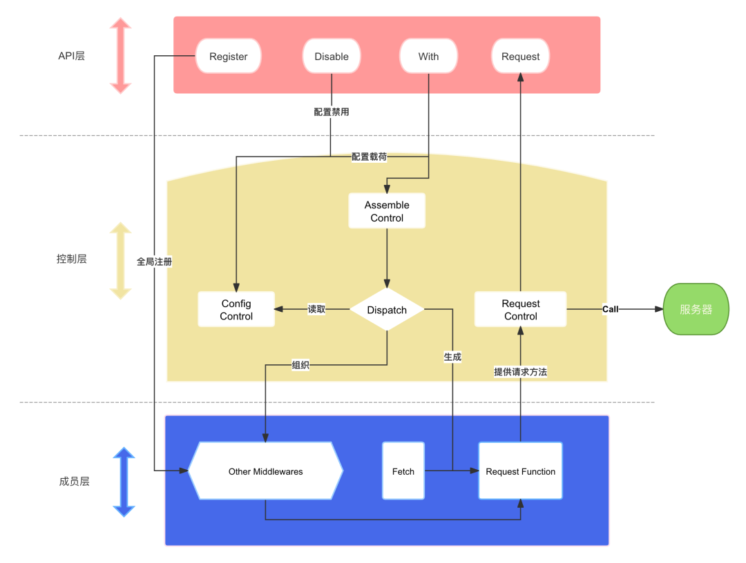 如若用一句话串联起这三个模块:在使用请求库发起请求时,调用装配控制器收集全部的临时中间件与 Payload(载荷),同时将 Payload 存入配置控制器中,收集完毕后通过组合中间件逻辑产出请求方法,同时配置控制器将产出中间件配置上下文,将这些物料一齐汇向请求控制器,创建请求上下文,发起请求。